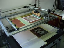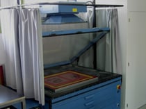 Belichtung der Mobileobjekte auf das Drucksieb im Vakuumkopierrahmen.